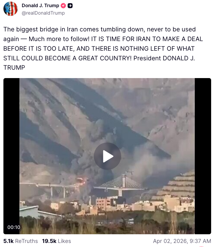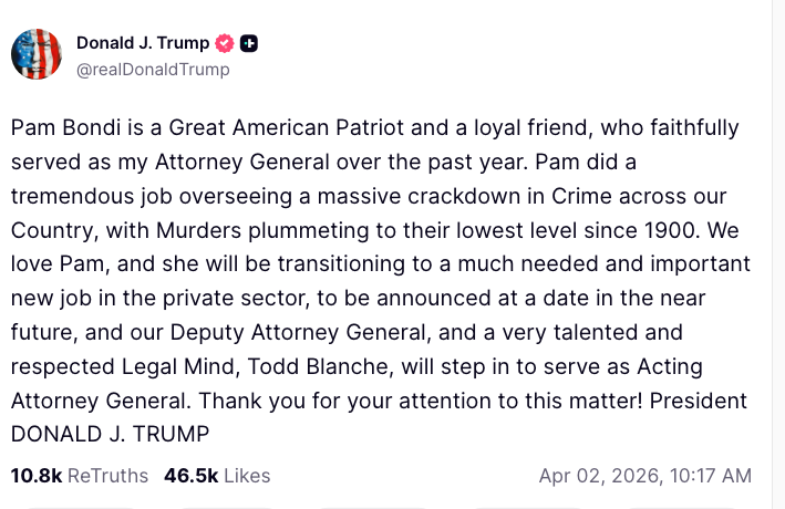 — Attorney General Pamela Bondi (@AGPamBondi) April 2, 2026