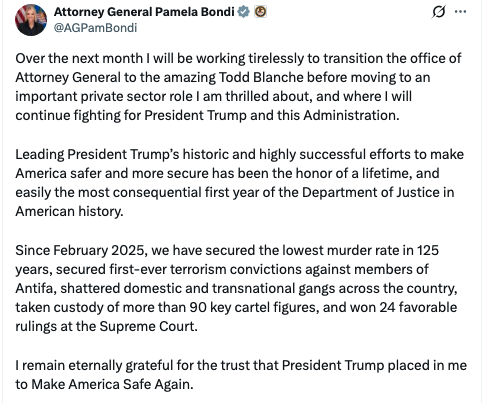 Over the next month I will be working tirelessly to transition the office of Attorney General to the amazing Todd Blanche before moving to an important private sector role I am thrilled about, and where I will continue fighting for President Trump and this Administration.…