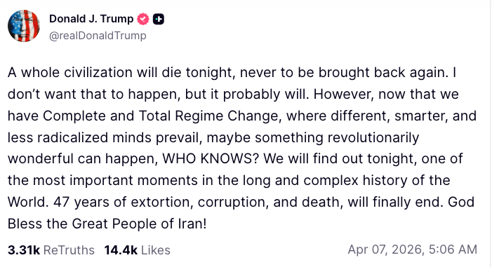 Right, because telling the world “a whole civilization might die tonight”, that he doesn’t want it but “it will probably happen”, is really lowering the temperature. Sure.