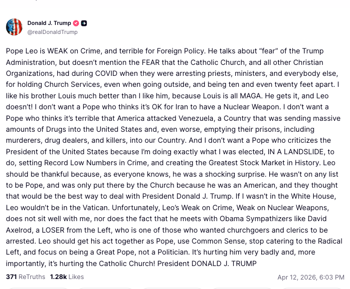 Trump: No, because Pope Leo said things that were wrong, he was very much against what I'm doing with regard to Iran. He’s weak on crime. He went public. I’m just responding to Pope Leo. There’s nothing to apologize for. pic.twitter.com/0ocQFqiplf