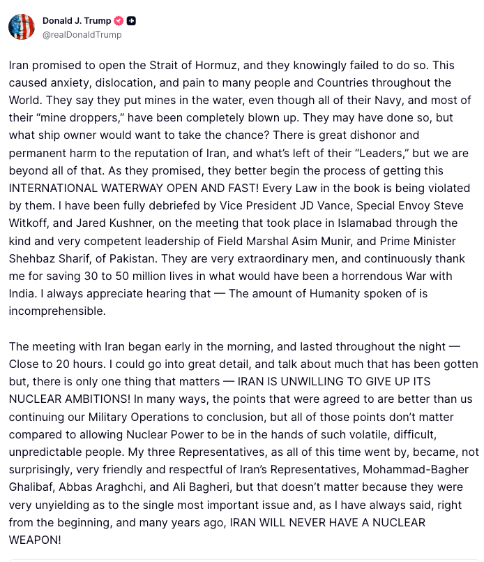 After talks with Iran failed, the Idiot in Chief announced the U.S. would blockade the Strait of Hormuz—joining Iran in the “no one gets through” strategy.