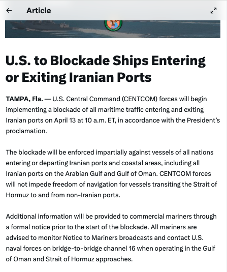 Centcom posted an article on Twitter that explained the blockade: