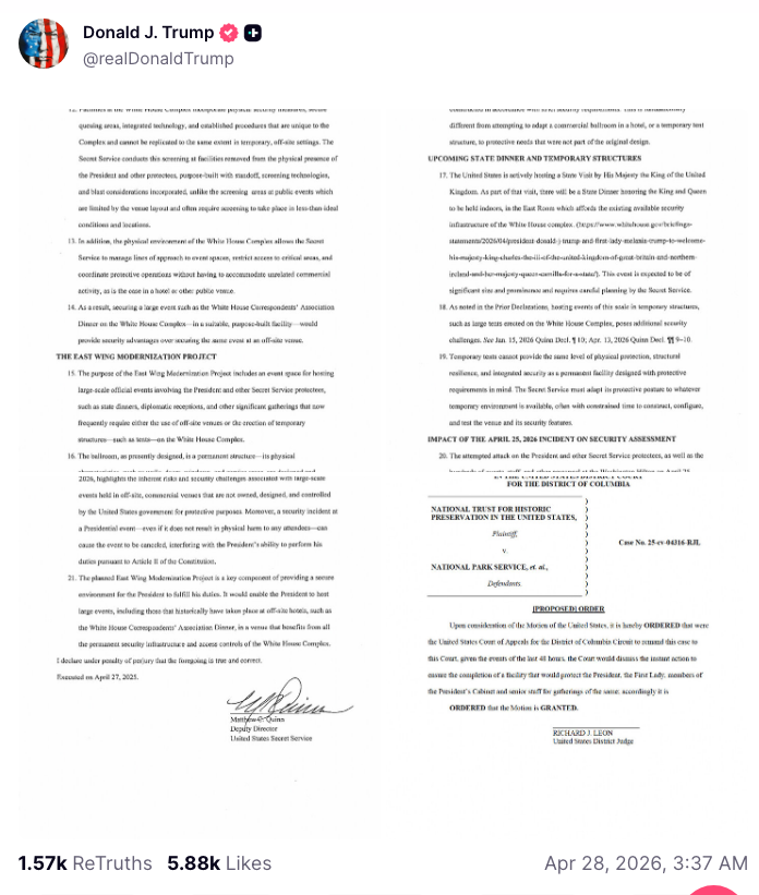I’m only sharing one of the court filing posts because nobody needs four versions of the same filing. The ballroom nobody asked for has now apparently been elevated to a matter of national security, complete with “Trump Derangement Syndrome,” complaints about the National Trust for Historic Preservation, and a random “Barack Hussein Obama” mention for dramatic effect.