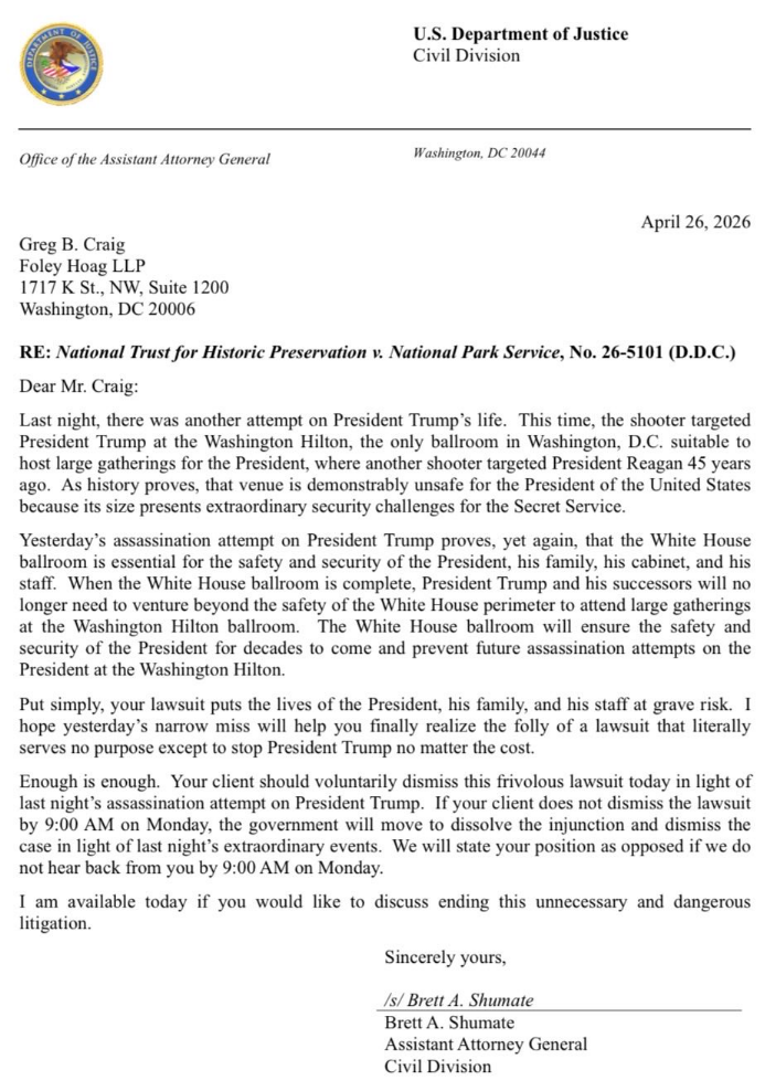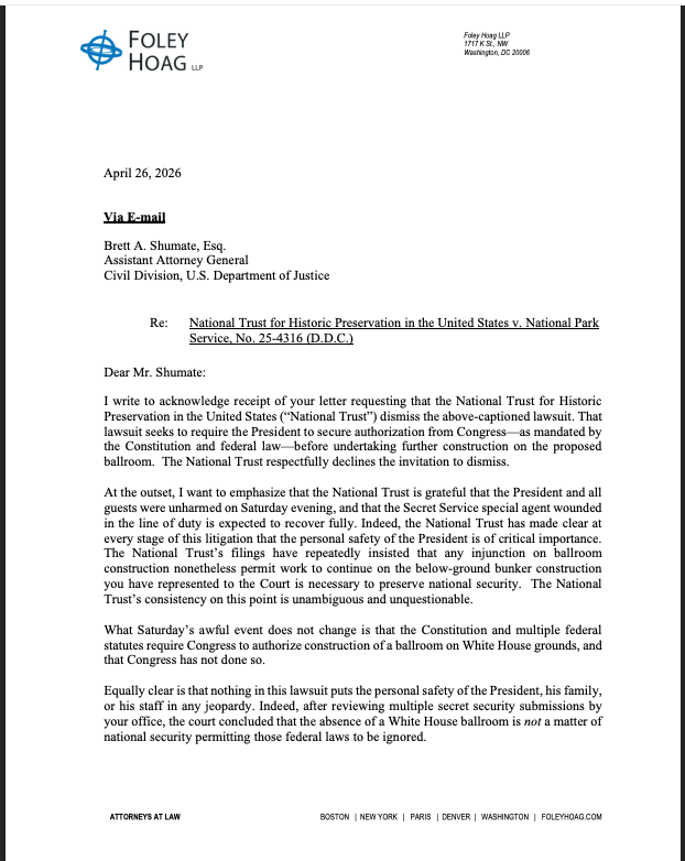 The National Trust for Historic Preservation will continue its legal challenge to President Trump’s planned ballroom, rejecting a DOJ demand to drop the case because of the shooting this weekend at the White House correspondents’ dinner. https://t.co/2SDzFDevg7