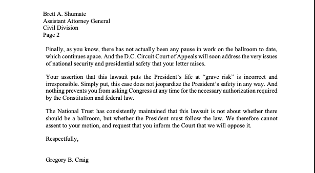 This letter and lawsuit explain how come Senator Republicans held a dumb presser to talk about getting the ballroom funded.